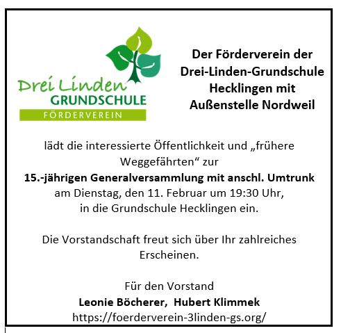 Der Förderverein der 3 Linden Grundschule lädt am 24. April zur Generalversammlung ein. Die Veranstaltung findet um 19.30 Uhr am Standort Hecklingen statt.
